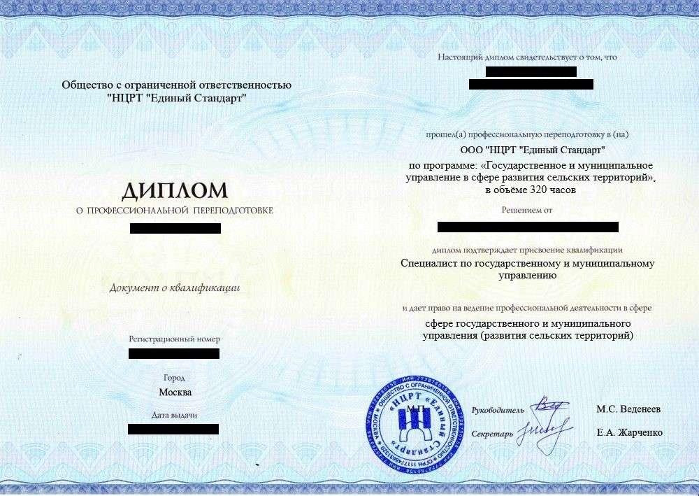 • «Специалист по государственному и муниципальному управлению» с правом осуществления профессиональной деятельности в сфере государственного и муниципального управления (развития сельских территорий)