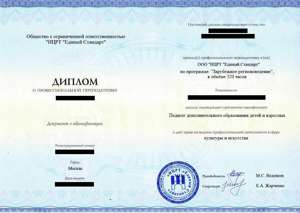 • Диплом о профессиональной переподготовке установленного государством образца. Срок действия: бессрочно